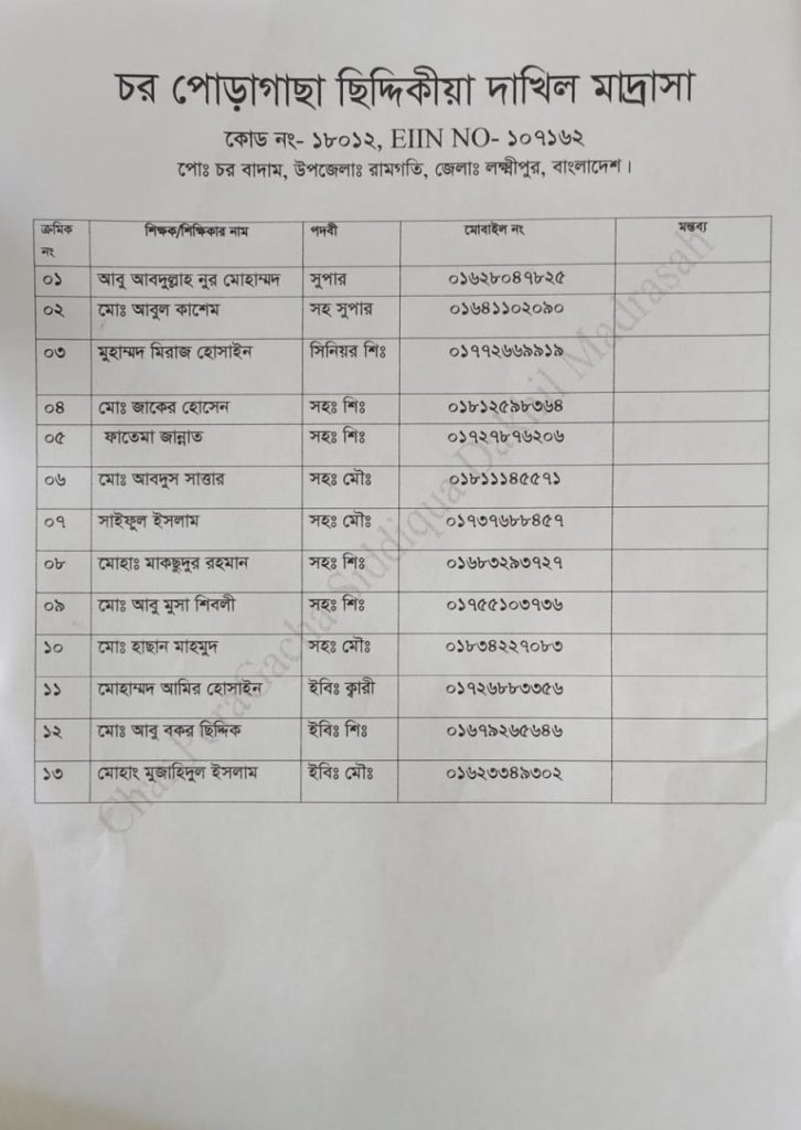এতদ্বারা চর পোড়াগাছা ছিদ্দিকীয়া দাখিল মাদ্রাসার দাখিল পরীক্ষা -২০২৬ ইং এর টেষ্ট পরীক্ষা আগামী ১০ ই নভেম্বর-২০২৫ ইং অনুষ্ঠিত হইবে।